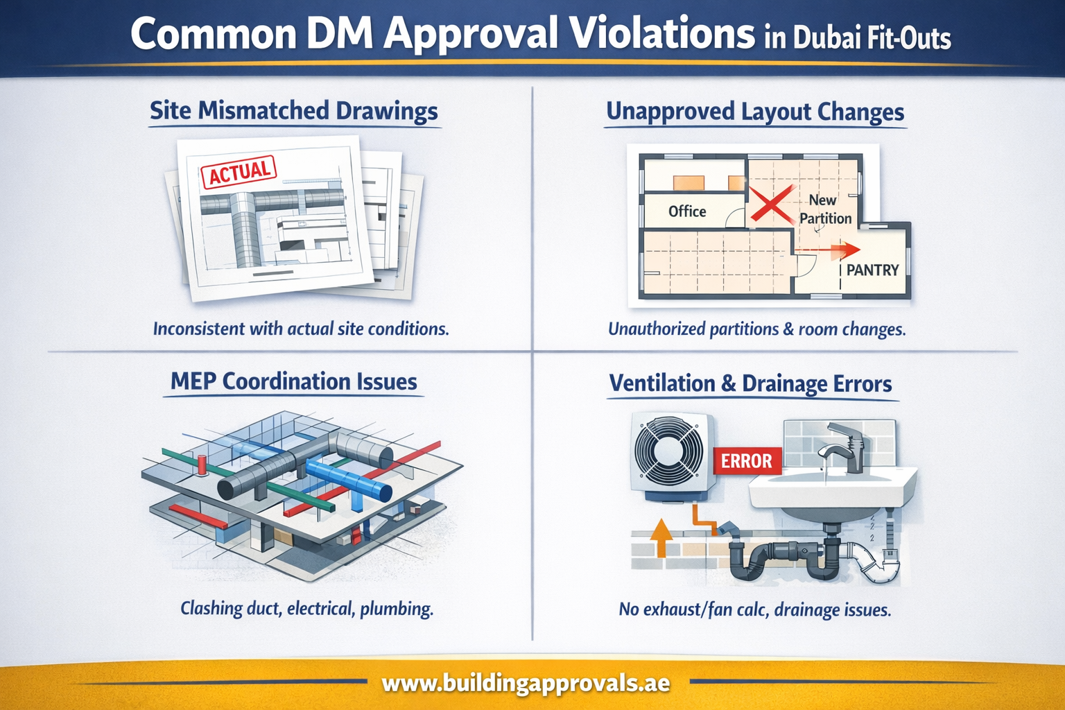 This guide covers the most common DM Approval violations during the fit-out approval process in Dubai, UAE, why they happen, and the practical steps you can take to avoid rejections, fines, and stop-work situations.